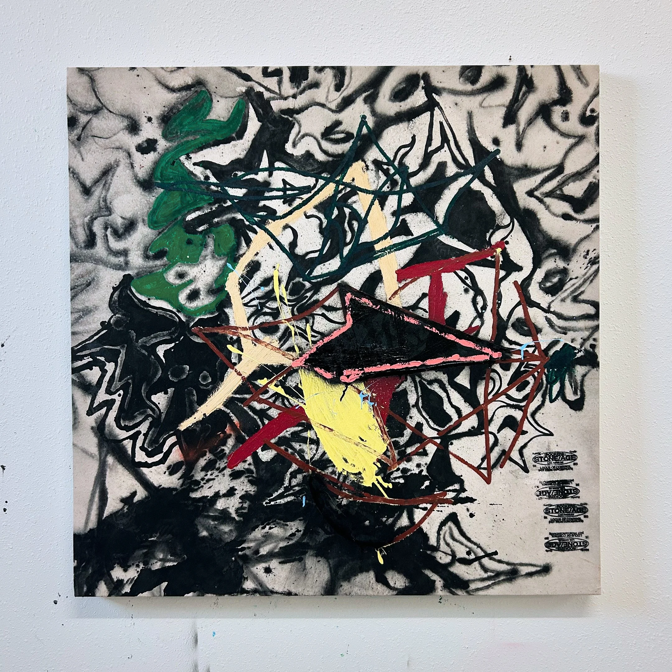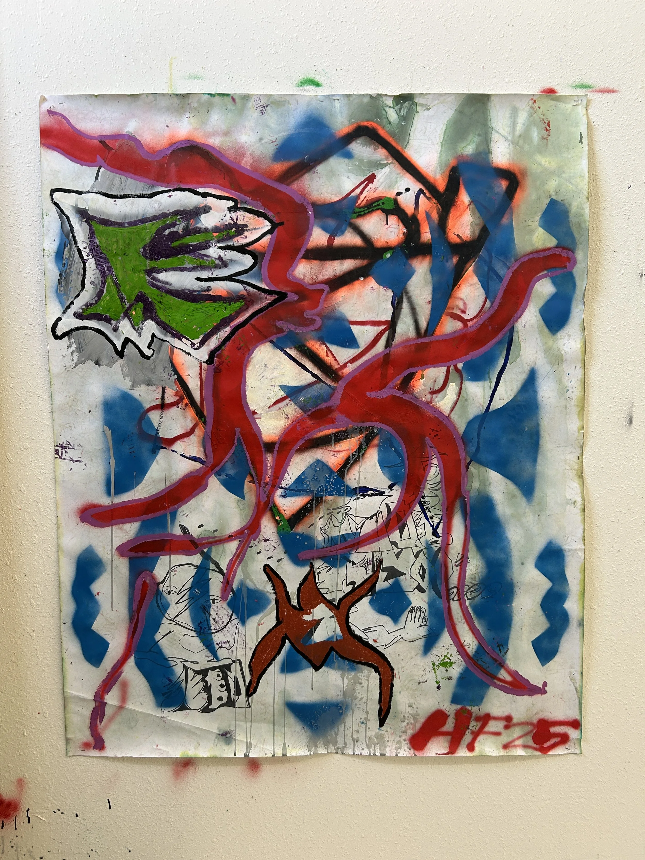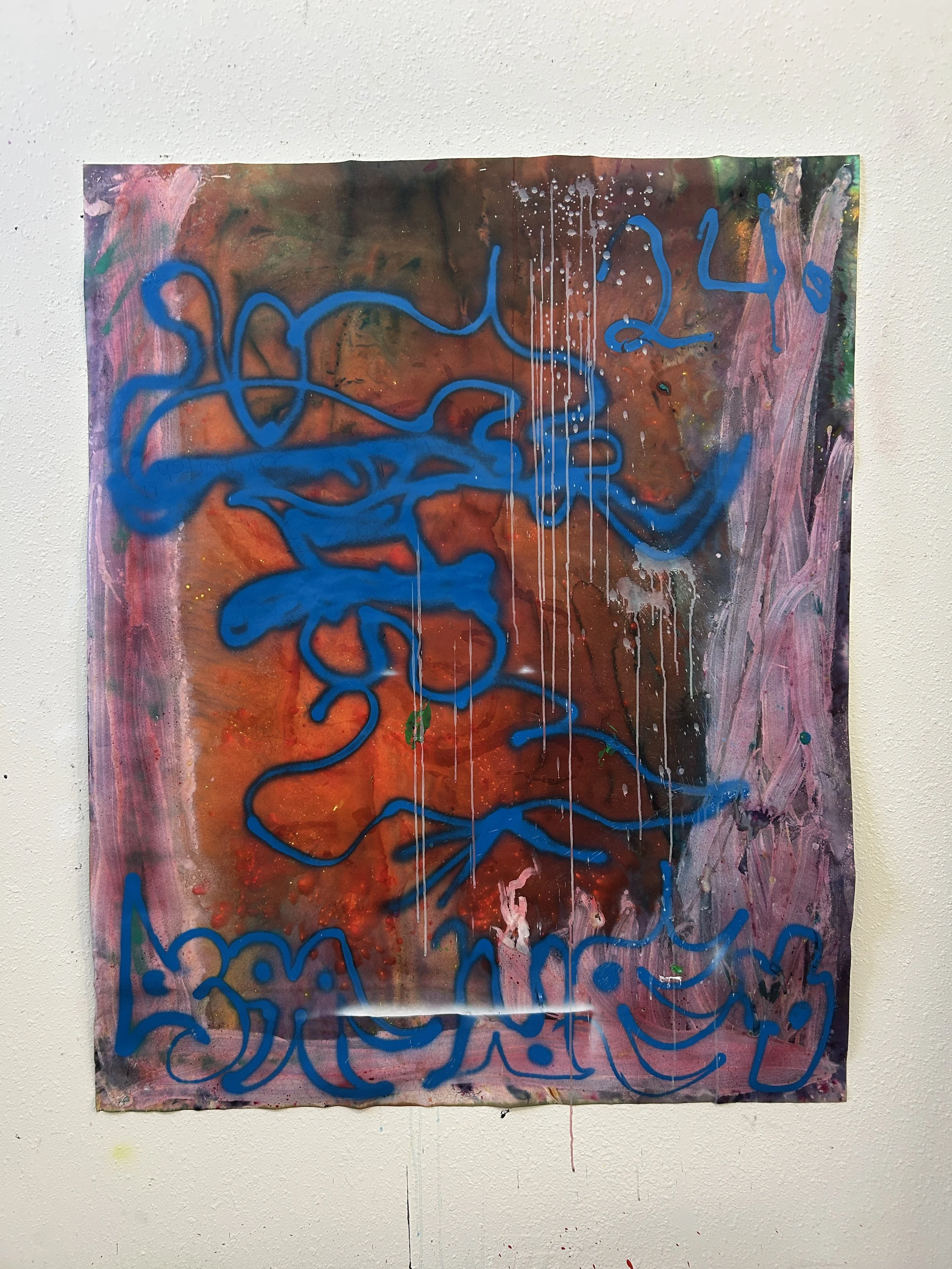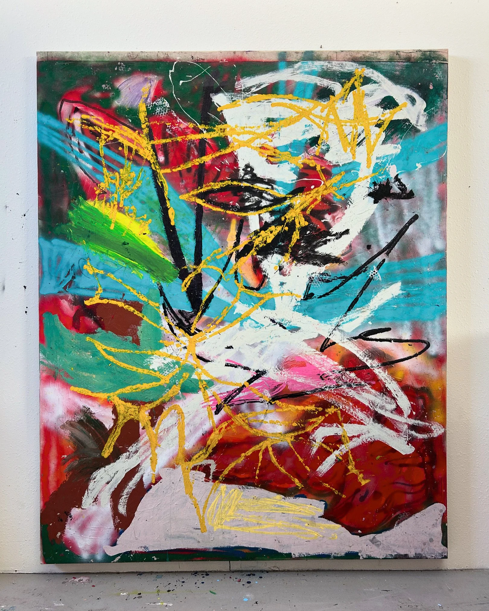 "Untitled", 2022-2024 oil, acrylic, spray paint on canvas (60"x63") Collaboration with Jonathan DeDecker