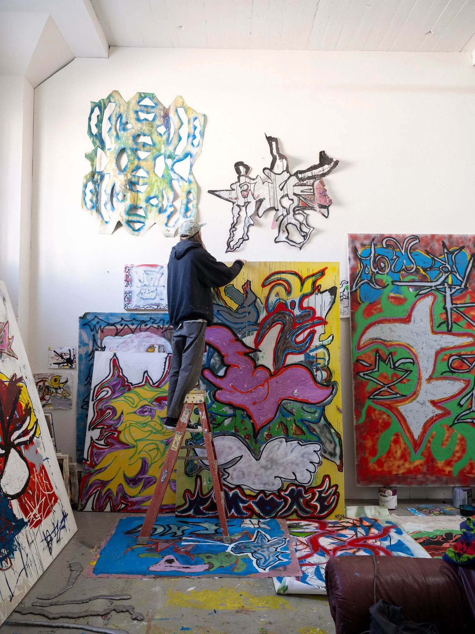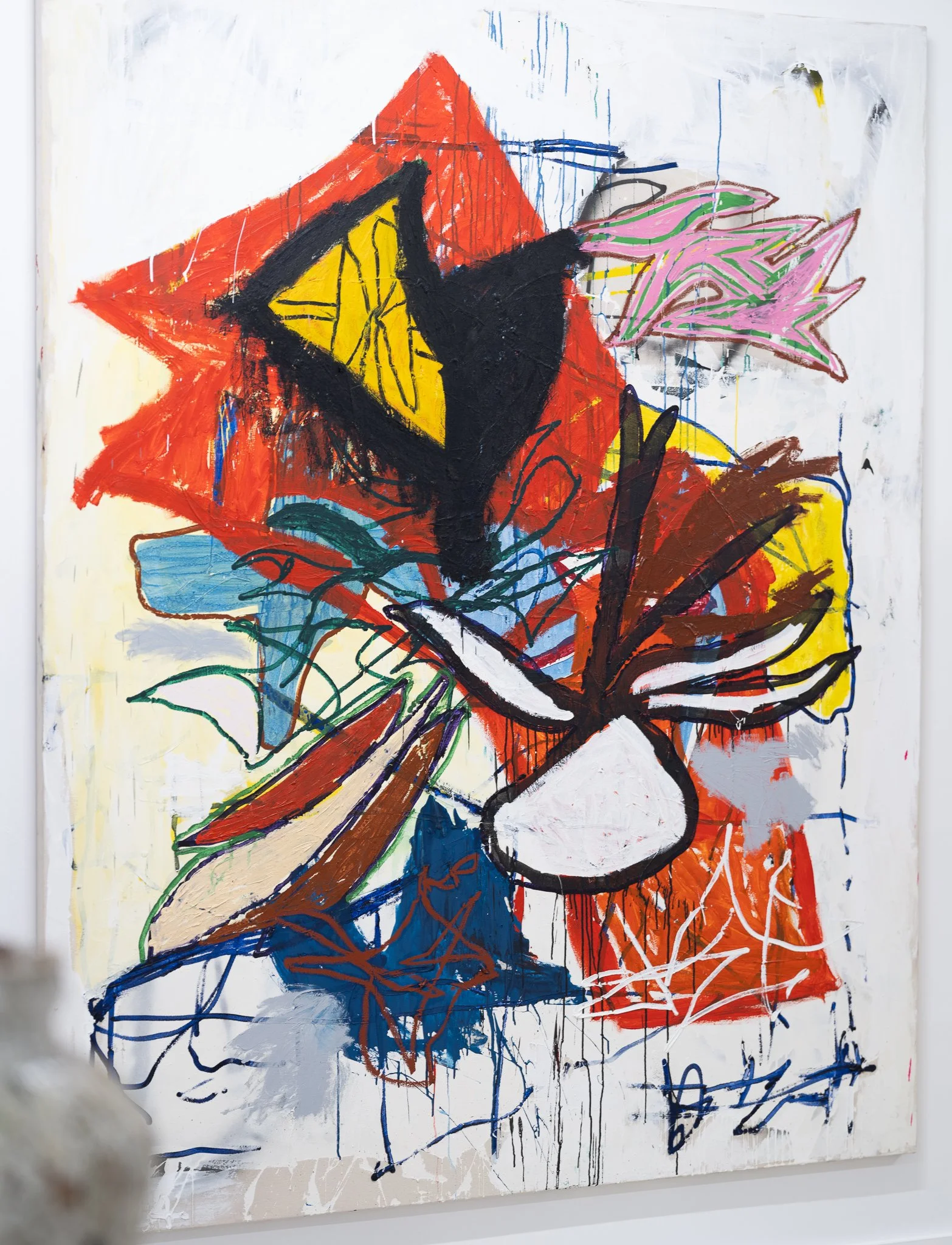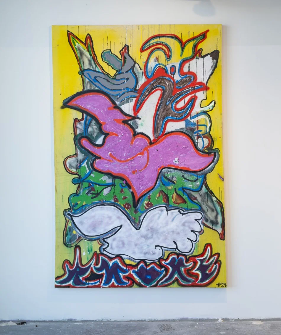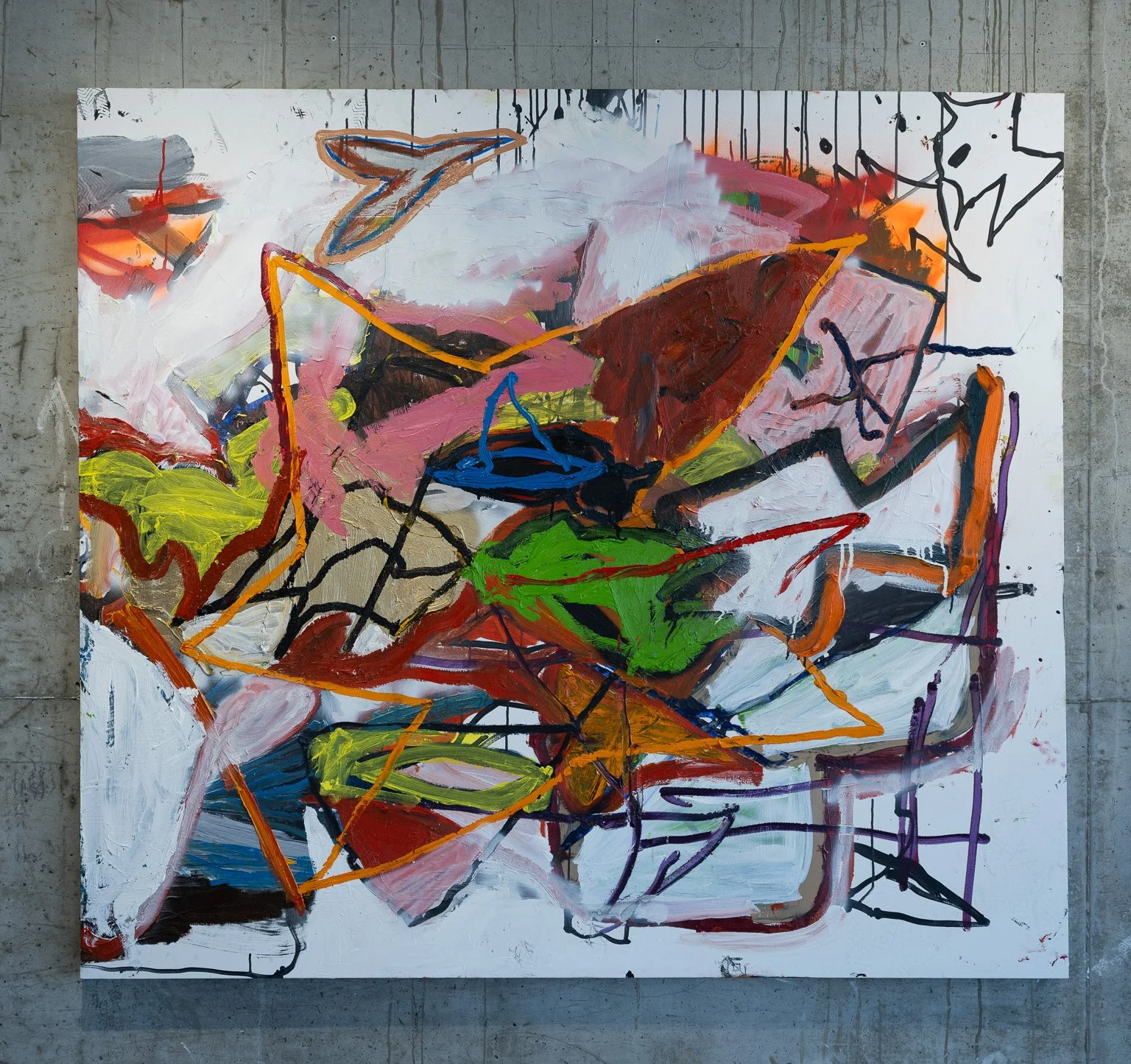 "Untitled", 2022-2024 oil, acrylic, spray paint on canvas (60"x63") Collaboration with Jonathan DeDecker