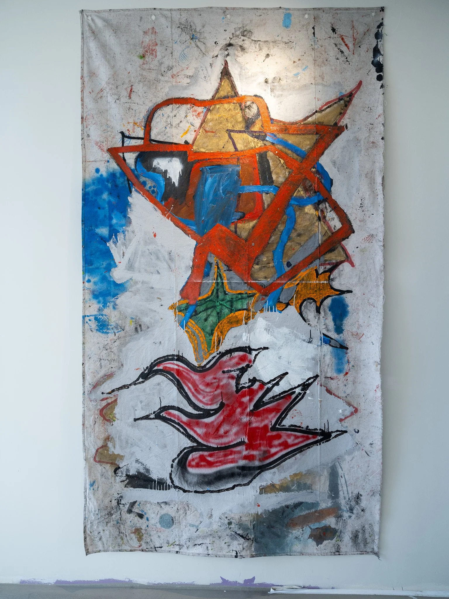 "Untitled", 2025 oil, acrylic, spray paint on drop cloth (53.25"x91")