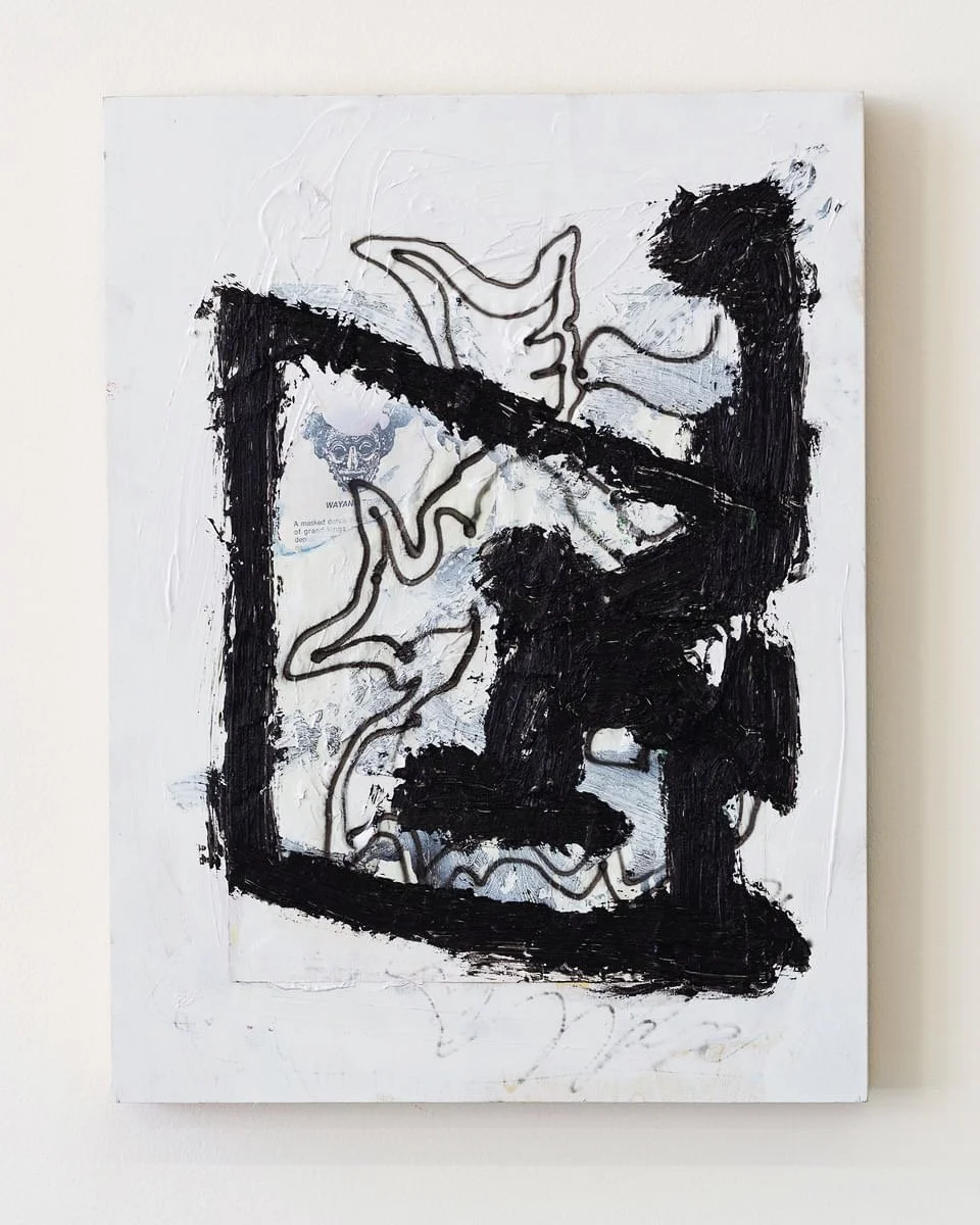 "Wayang Topang", 2024 oil stick, collage, air brush, spray paint on wood panel (11"x14")