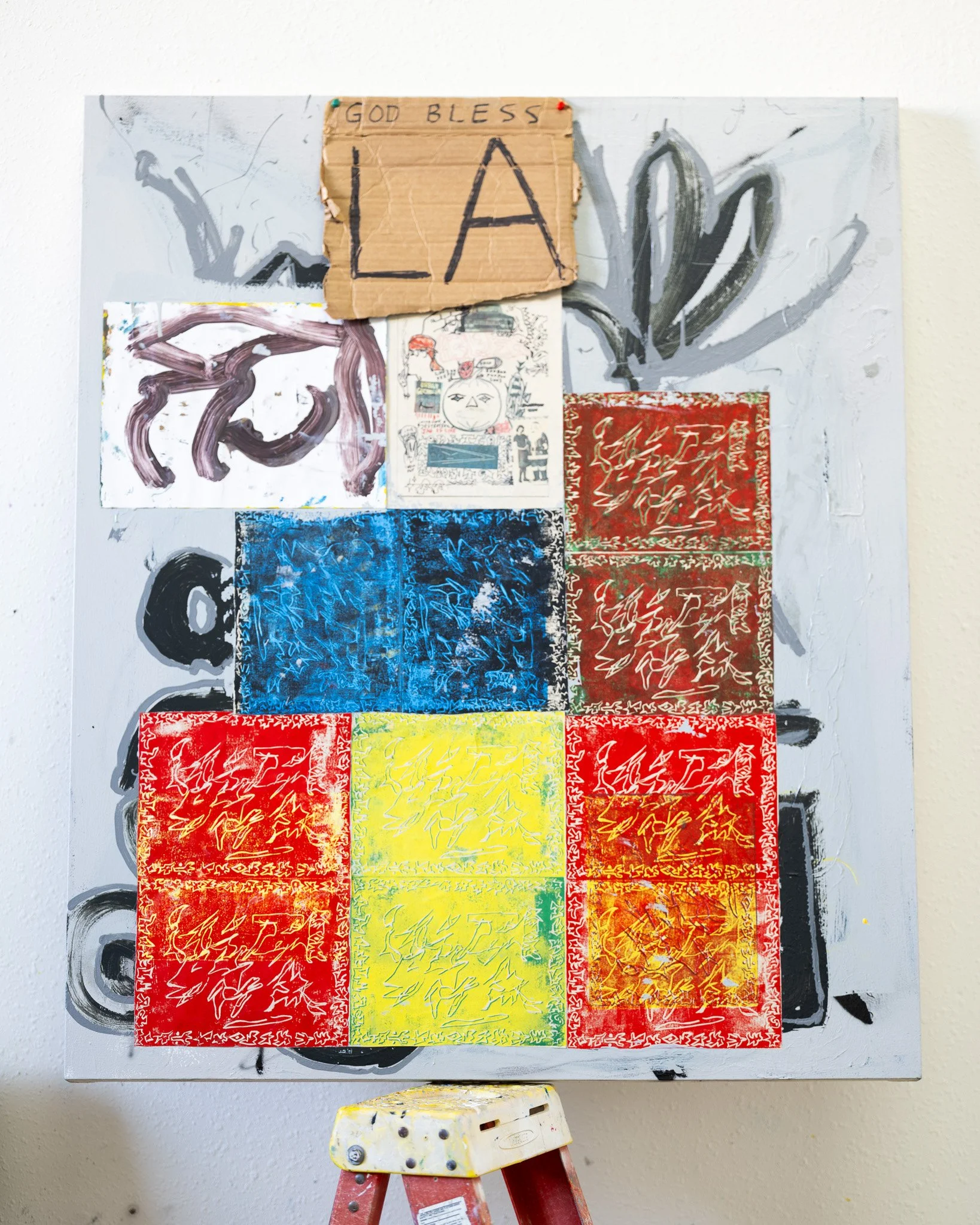 "God Bless LA", 2024 acrylic, collage, woodblock print canvas (30"x40") Collaboration with William Way
